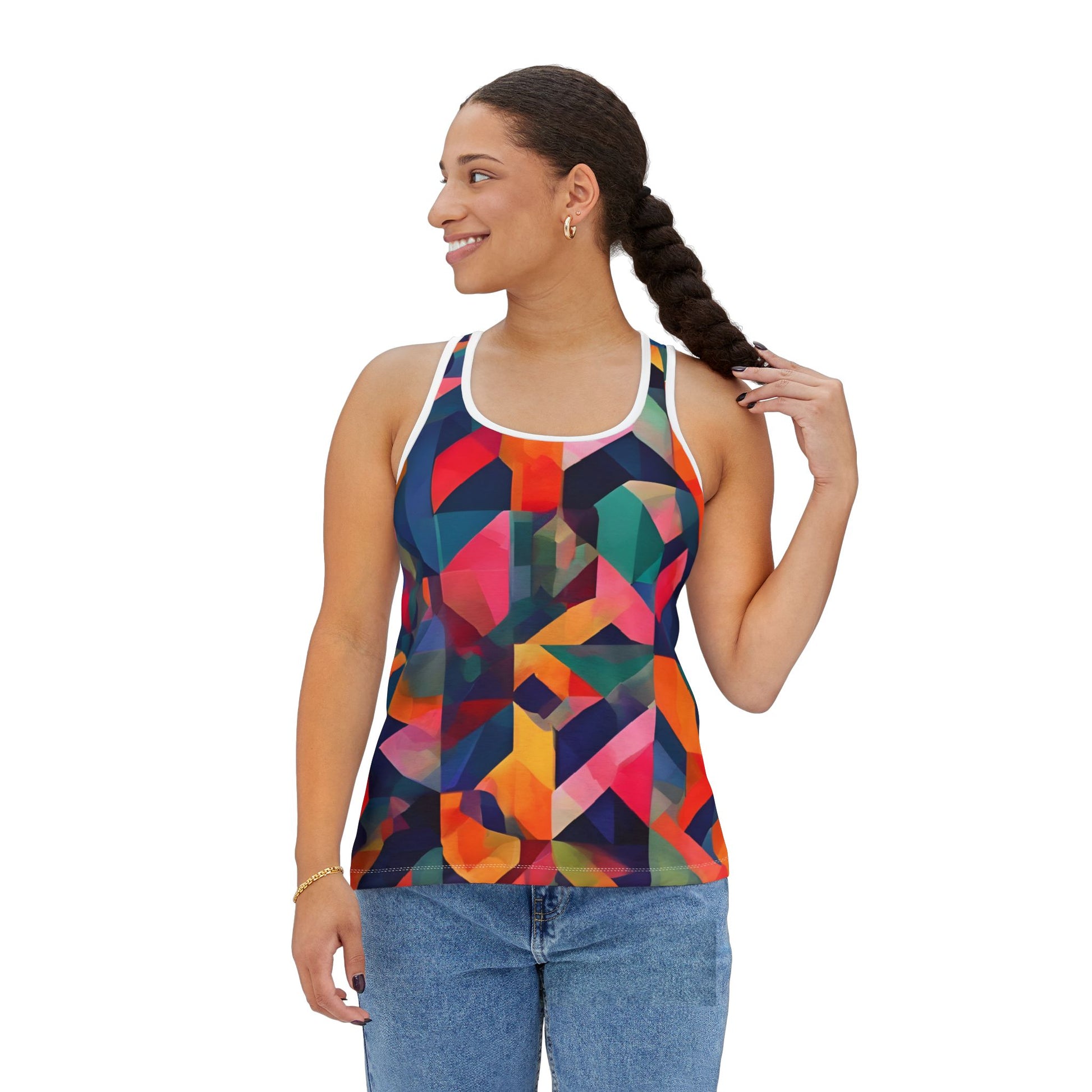 Abstract Printed Tank Top for Women, made of durable polyester and spandex blend with vibrant colors. The high cut neckline and cinched back add a stylish touch to this versatile top. Perfect for women who love bold, unique designs and want a comfortable and fashionable clothing option. Ideal for summer, music festivals, beach days, and casual outings.